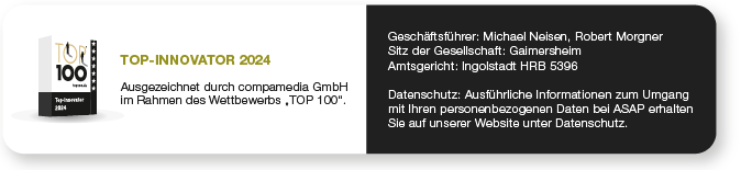 ASAP Holding GmbH Sachsstraße 1a | 85080 Gaimersheim ivana.nebl@asap.de mailto:ivana.nebl@asap.de | +49 174 1963535 | asap.de https://www.asap.de/