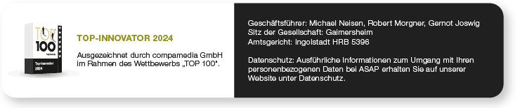 ASAP Holding GmbH Sachsstraße 1a | 85080 Gaimersheim ivana.nebl@asap.de mailto:ivana.nebl@asap.de | +49 174 1963535 | asap.de https://www.asap.de/
